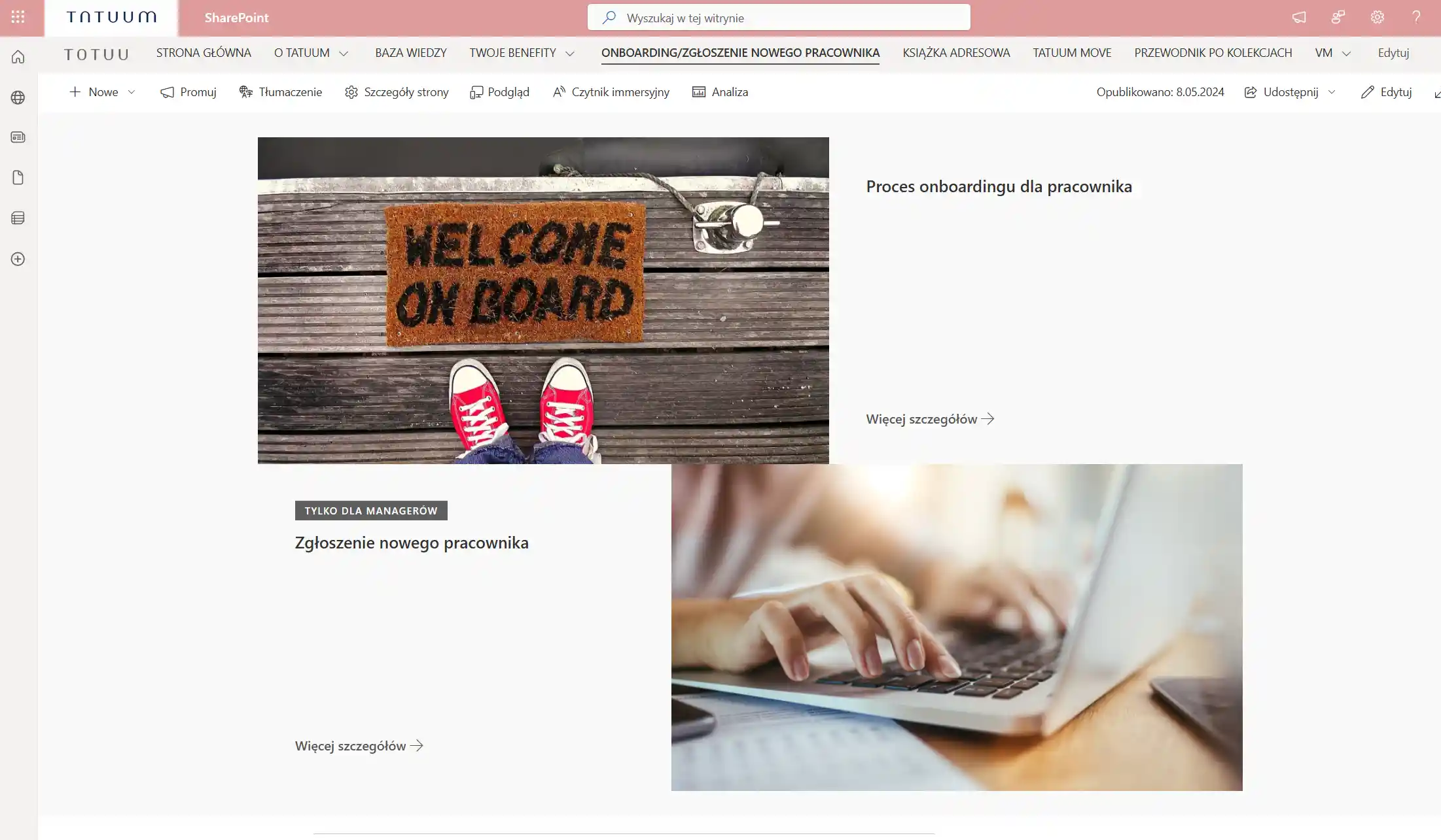 Jednocześnie zapewniło możliwość dalszego, również samodzielnego rozwoju intranetu. Oczywiście SharePoint został dostosowany wizualnie do designu i wytycznych marki TATUUM.